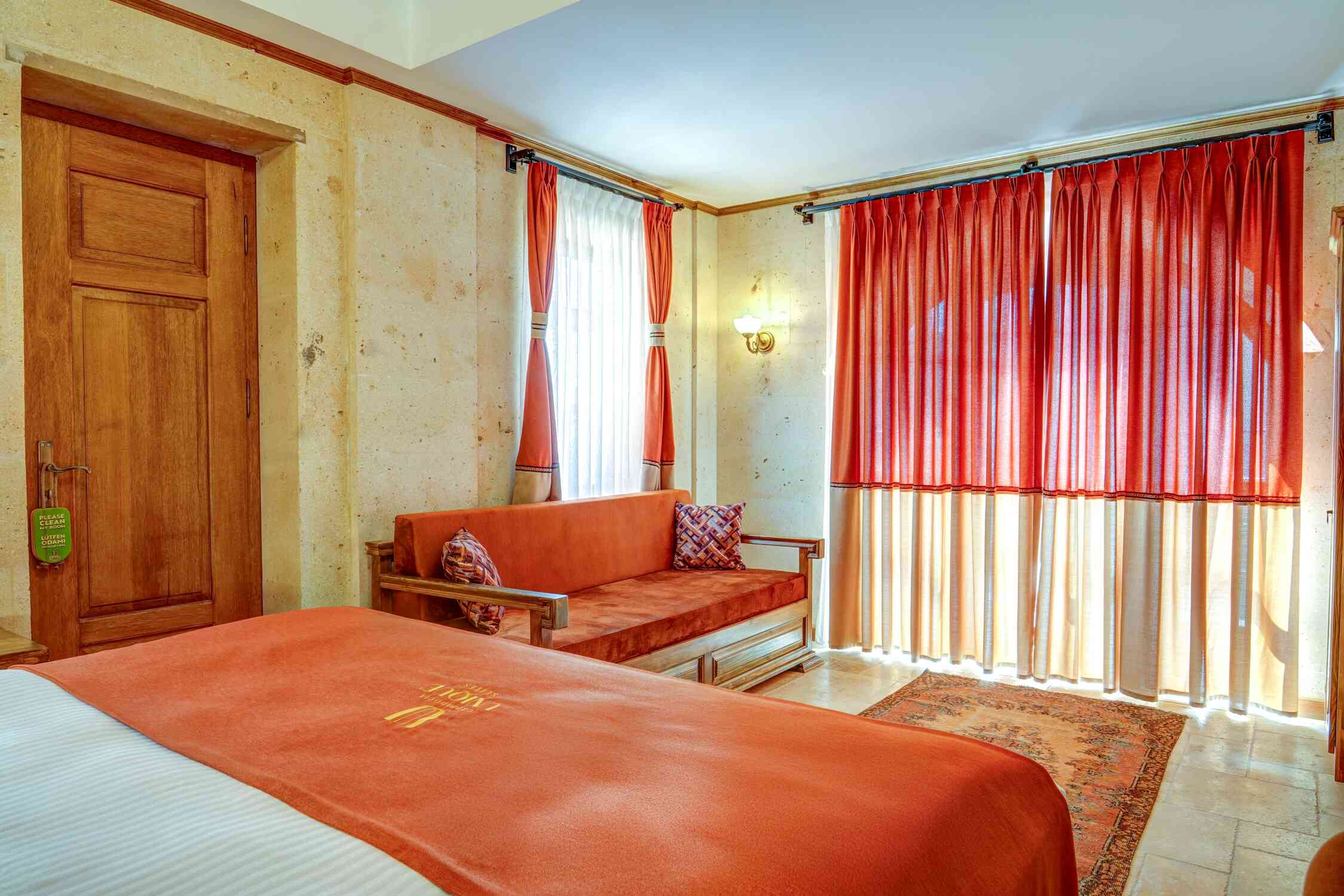 The Standard Room at Unique Cappadocia Palace offers a comfortable 28-square-meter space, designed for guests who seek both practicality and style. The room features a double bed with a custom-carved wooden headboard, a wooden sofa seating area, a work desk, and a vanity table. Central air conditioning and underfloor heating provide comfort throughout the year.
