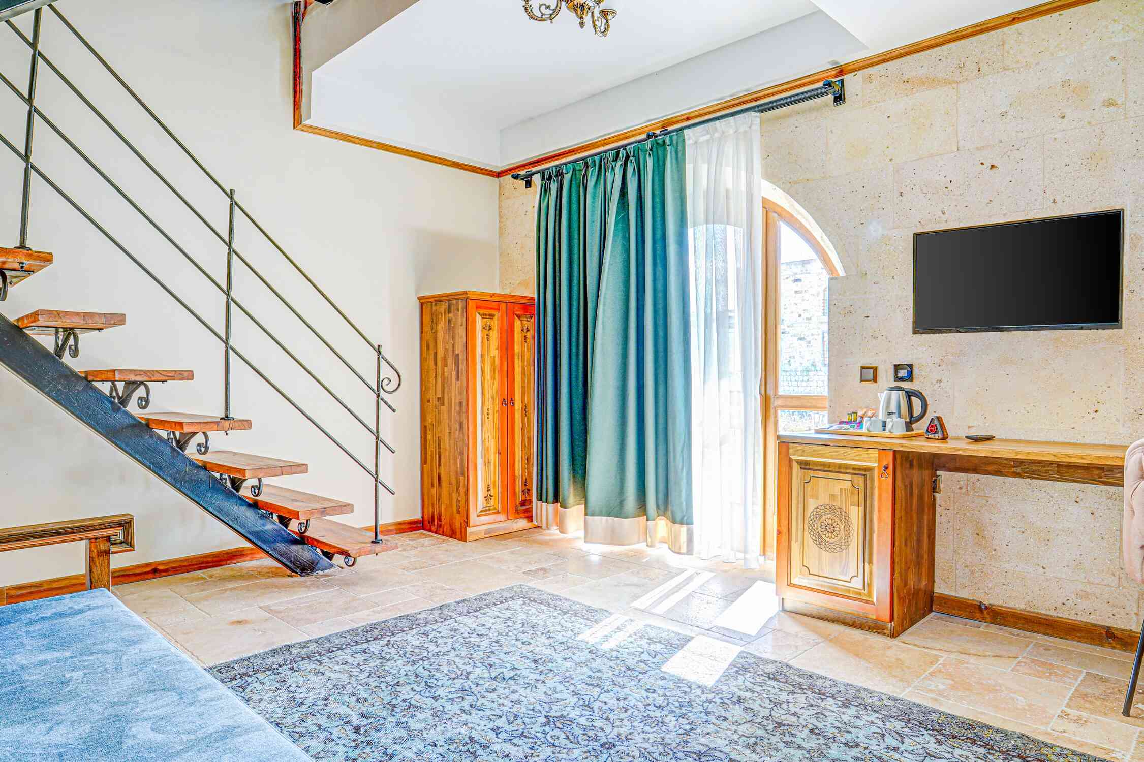 The Terrace Suite Room at Unique Cappadocia Palace is a spacious 60-square-meter, two-story suite offering a stunning view of Cappadocia. The lower level features a cozy sitting area with a wooden sofa, work desk, and vanity table, while the upper level houses the bedroom with a double bed. The room also boasts a private terrace with a jacuzzi, perfect for relaxing while taking in the breathtaking surroundings.