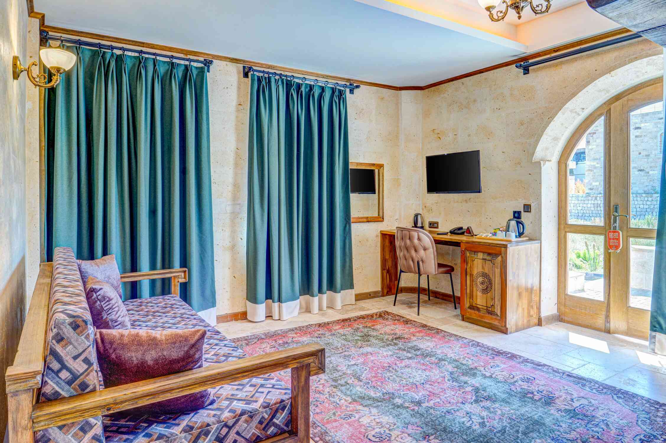 The Terrace Jacuzzi Suite Room at Unique Cappadocia Palace offers a luxurious 60-square-meter, two-story space with breathtaking views of Cappadocia. The lower level includes a cozy sitting area with a wooden sofa, work desk, and vanity table, while the upper level features the bedroom with a double bed. The room’s highlight is its private terrace, complete with a jacuzzi, offering the perfect spot to relax and enjoy the stunning scenery of the region.