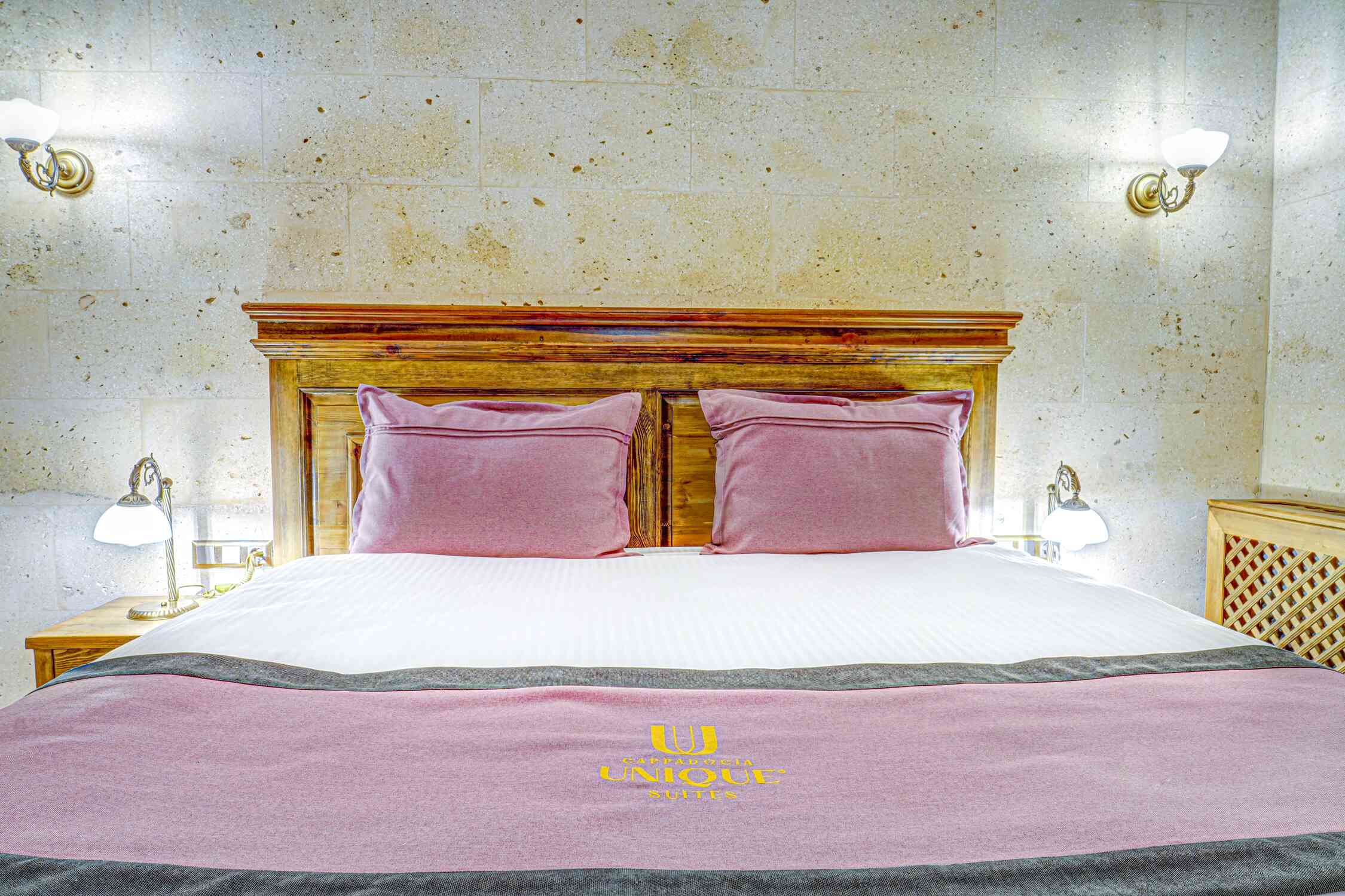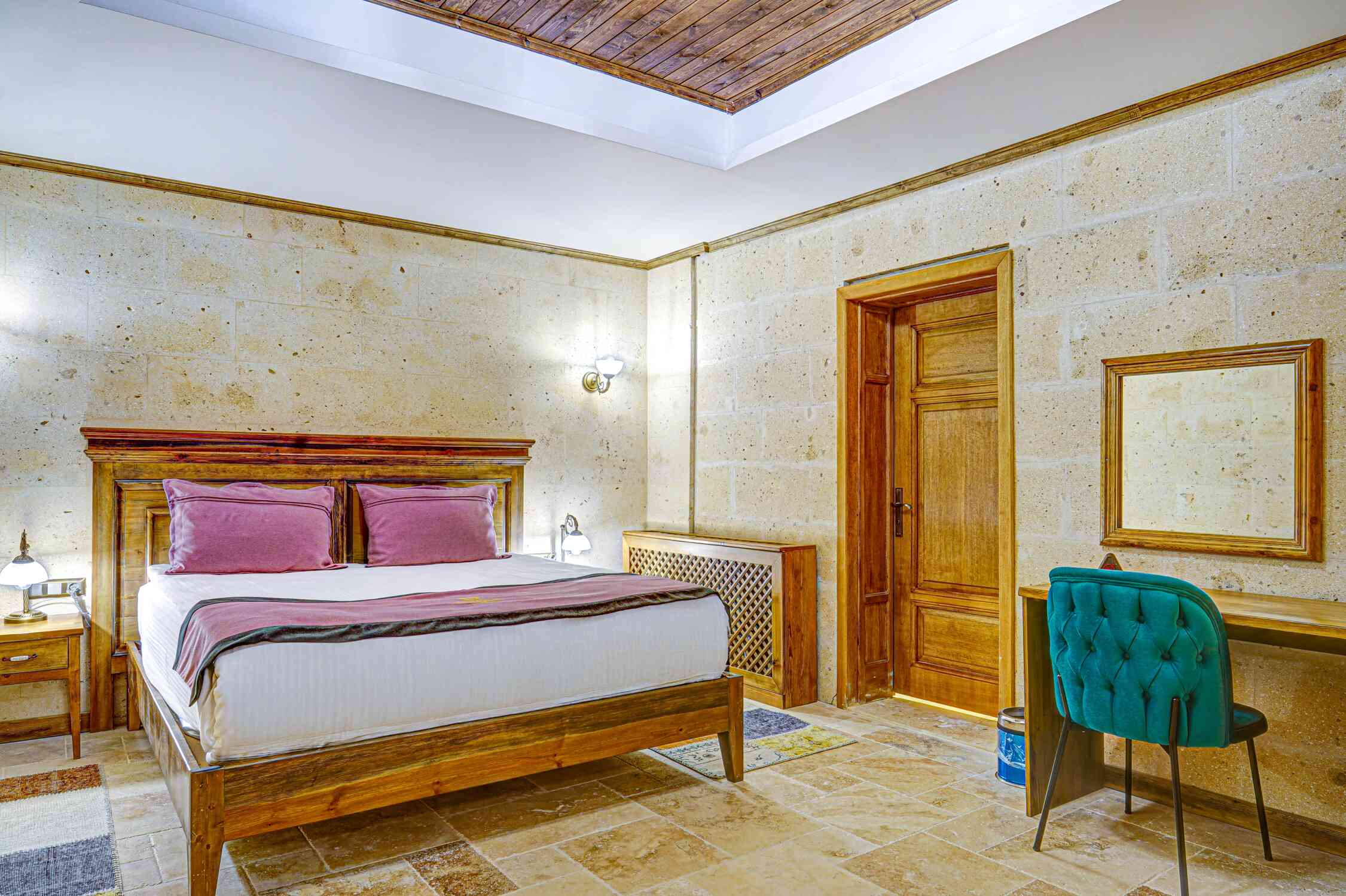 The Family Suite Room at Unique Cappadocia Palace offers a spacious 45-square-meter area, designed to accommodate families. This room features a double bed, two single beds, a wooden sofa seating area, a work desk, and a vanity table. It’s the perfect choice for families seeking both comfort and space while visiting Cappadocia.